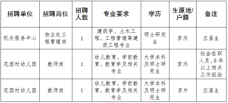 (四)應屆生為2020年全國普通高等學校應屆畢業(yè)生(不含定向、委培、部隊院校、兩年擇業(yè)期內的未就業(yè)畢業(yè)生)。京外生源應聘人員須符合申請辦理在京就業(yè)落戶條件,大學本科生不超過24周歲(1995年2月1日以后出生),碩士研究生不超過27周歲(1992年2月1日以后出生);京內生源應聘人員須為北京市戶籍。