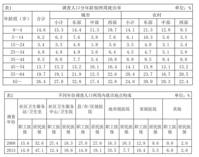 兩周就診率被定義為每百人中兩周內(nèi)因病或身體不適尋求各級醫(yī)療機構(gòu)治療服務(wù)的人次數(shù)。第五次國家衛(wèi)生服務(wù)調(diào)查結(jié)果顯示,調(diào)查地區(qū)居民兩周就診率為13%,其中城市地區(qū)為13.3%,農(nóng)村地區(qū)為12.8%。城市地區(qū),東部、中部、西部兩周就診率分別為15.4%、8.8%、15.8%;農(nóng)村地區(qū),東部、中部、西部兩周就診率分別為16.1%、11.4%、11%。
